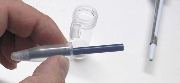 2.ペッスル先端で供試菌株の凍結乾燥菌体を少量とり、丸底1.5ml チューブに入れる